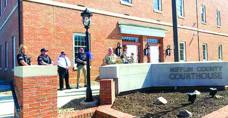 Scouts from Troop 106 of Lewistown raise a flag in front of the Mifflin County Courthouse on Monday as part of The Light to Unite: Flags Across the Commonwealth, a statewide initiative to celebrate America’s 250th anniversary. The same three flags travel from county to county until they have flown over all 67 Pennsylvania counties. The scouts were joined by the Mifflin County Sheriff’s Department, which partnered with the Juniata Valley Council of Scouting America to hold the ceremonies in the five-county region.