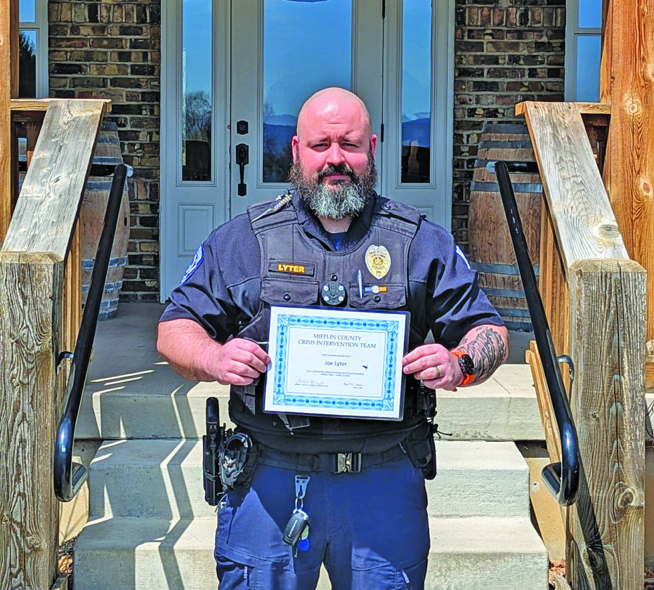 Several first responders from Mifflin County recently completed 40 hours of Crisis Intervention Training at the Birch Hill Event Center in Burnham. The course focused on understanding mental illness, de-escalation and reducing arrests by diverting individuals to mental health services. Lewistown Police Department officer Joe Lyter graduated, which brings the department up to 100 percent of officers who have completed this training.