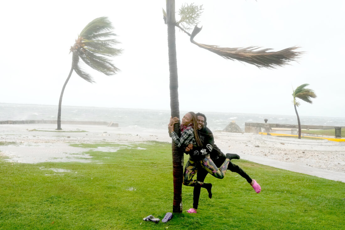A couple jokes around on the coast in Kingston, Jamaica, as Hurricane Melissa approaches, Tuesday, Oct. 28, 2025. (AP Photo/Matias Delacroix)