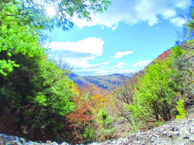 As I walked over a small bridge, I couldn’t help but admire the cascade of waterfalls and springs running down the facade of the mountain and into the Aughwick Creek. I zig-zagged up the rocky spine at the foot of the mountain and was delighted to see a collection of walking sticks. Propped up against the wooden signs that led to the trailhead, I got the impression that they had sort of a “If you need it, take it” vibe, and I knew that I was going to need one. I picked one that felt just right and began my ascent.