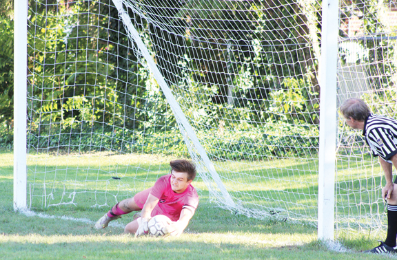 Mifflin County’s Conner Zimmerman lays out to stop a penalty kick from Palmyra’s Reuel Ryman on Wednesday evening at Mifflin County Middle School.