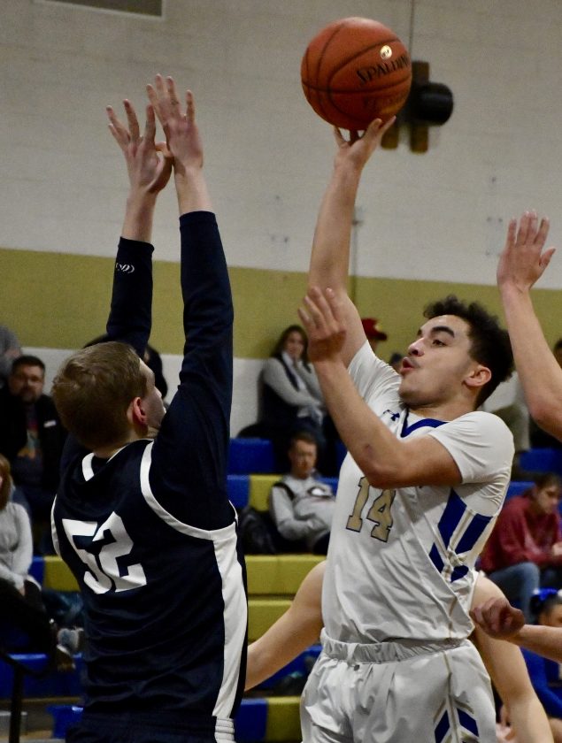 Mount Union’s Jayvien Brumbaugh shoots over top of Penns Valley’s Dakota Bradzina during the Trojans’ 51-36 non-conference victory over the Rams on Wednesday night at Mount Union High School.