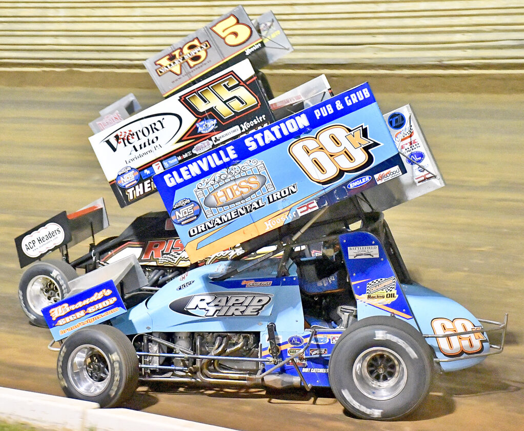 Lance Dewease (69), the lapped car of Jeff Halligan (45) and eventual winner Dylan Cisney (5) battle for the lead on the last lap of the first sprint car feature of the Living Legends Dream Race Saturday at Port Royal Speedway.