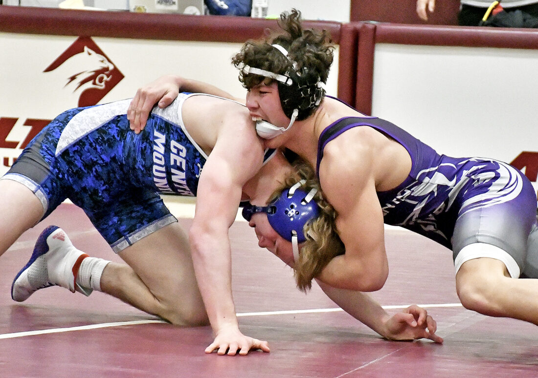 Mifflin County’s Parker Kearns controls Central Mountain’s Braylen Corter at 152 pounds.