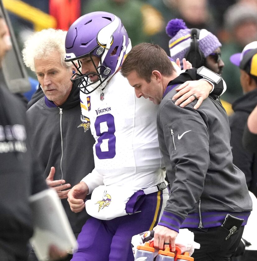Minnesota Vikings quarterback Kirk Cousins (8) is helped off the field after going down with an injury in the fourth quarter of an NFL game against the Green Bay Packers, Sunday, Oct. 29, 2023, in Green Bay, Wis. (Anthony Souffle/Star Tribune via AP)