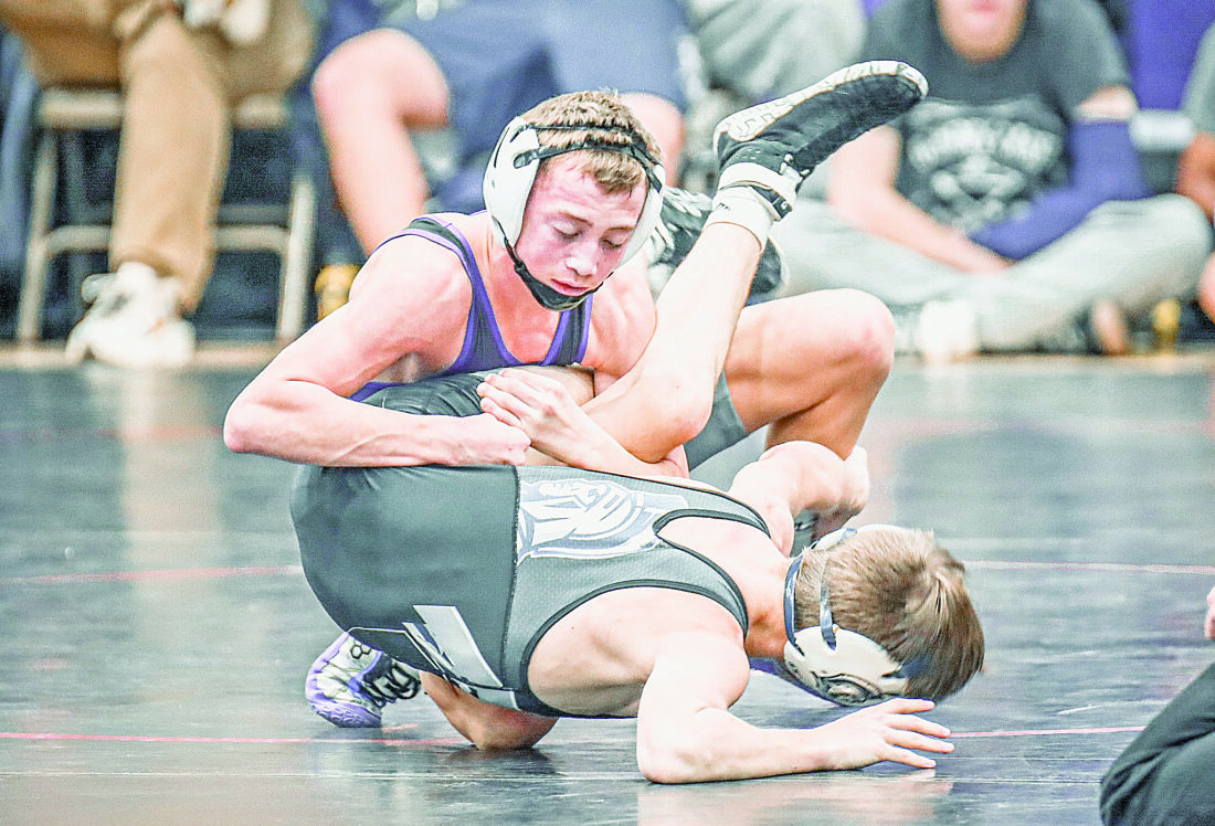Sentinel photo by KELSEY WHALEN Mifflin County’s Andrew Alexander takes down Chambersburg’s Ben Hoover en route to a 3-1 victory at the MPC Quad Meet at Mifflin County High School Saturday.