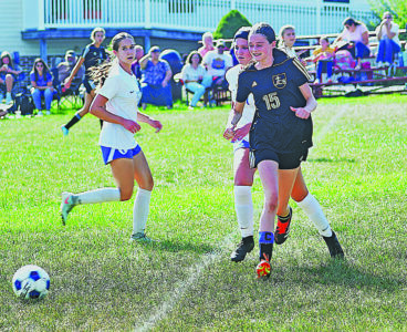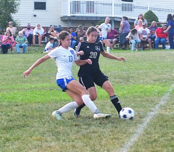 - Sentinel Photo by BOB HOCKENBROCK Juniata Christian School’s Nicole Lara (20) battles Norry Christian’s Evelyn Steckel for the ball.