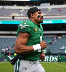 Philadelphia Eagles quarterback Jalen Hurts leaves after an NFL football game against the New York Giants on Sunday, Oct. 26, 2025, in Philadelphia. (AP Photo/Matt Slocum)