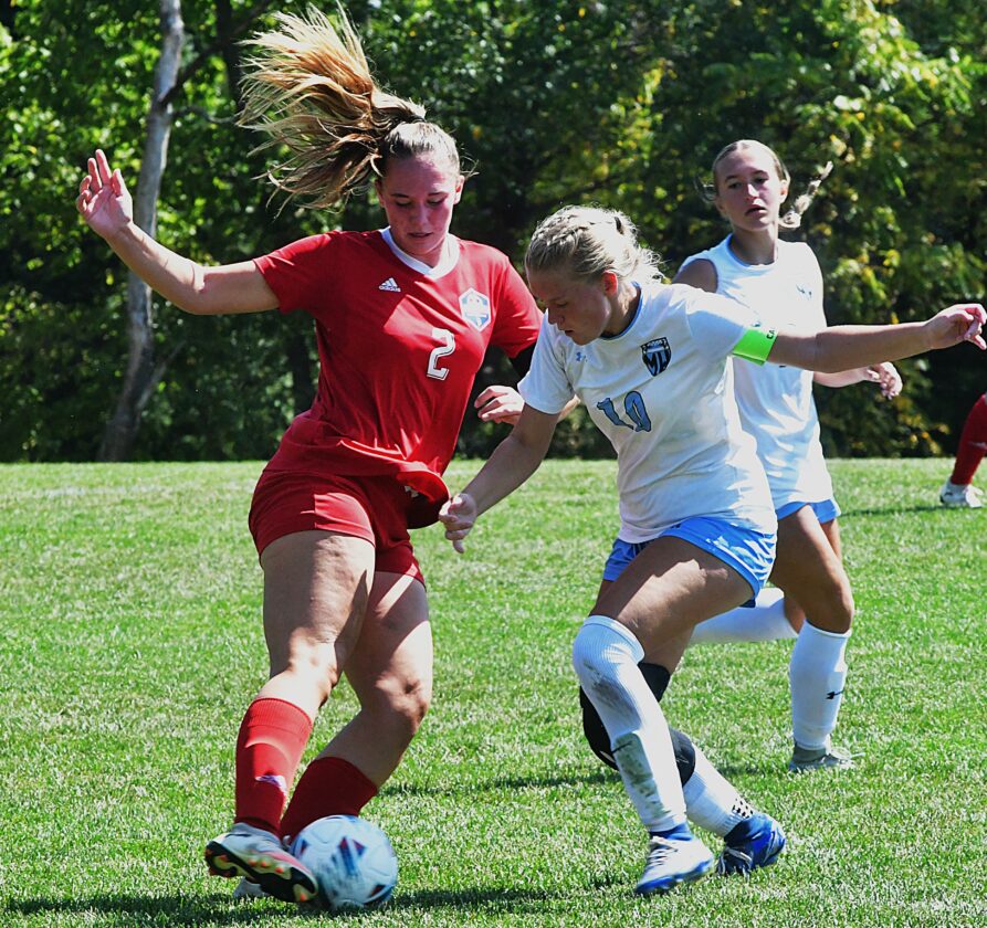 Sentinel photo by BOB HOCKENBROCK Juniata’s Mylee Landis tries to work the ball past Midd-West’s Ava Aitkins during a girls soccer game earlier this year.