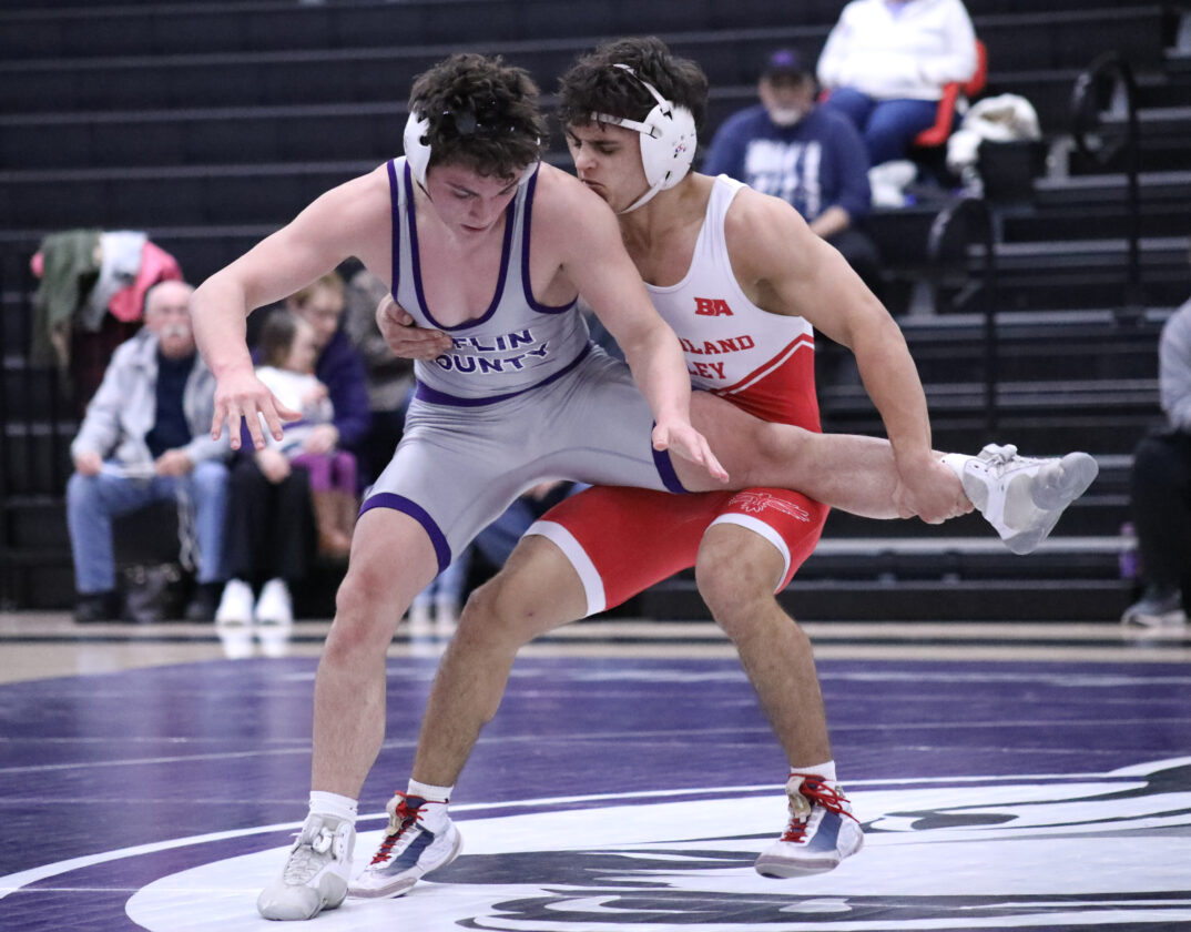 Sentinel photo by SAM BAUMGARDNER Mifflin County's Brian Albert competes with Cumerberland Valley's Dom Vogel Thursday evening at the Husky Gym in Highland Park.