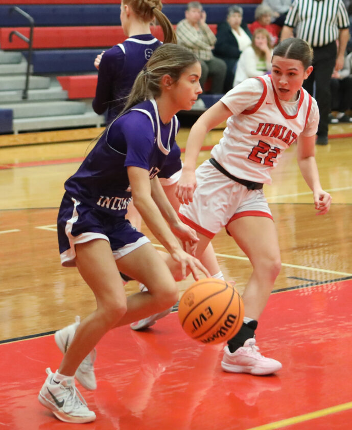 Sentinel photo by SAM BAUMGARDNER Juniata's Aubryn Deihl tries to defend Shamokin's Gianna Venna Thursday evening at the Indian Gym in Mifflintown.