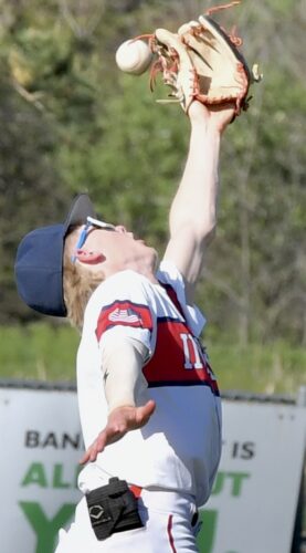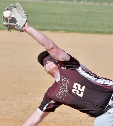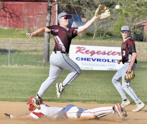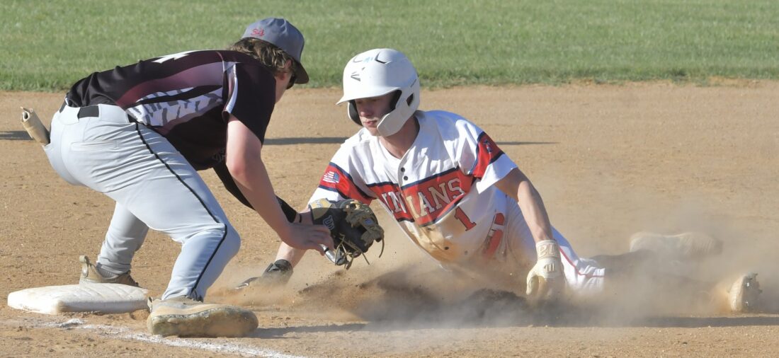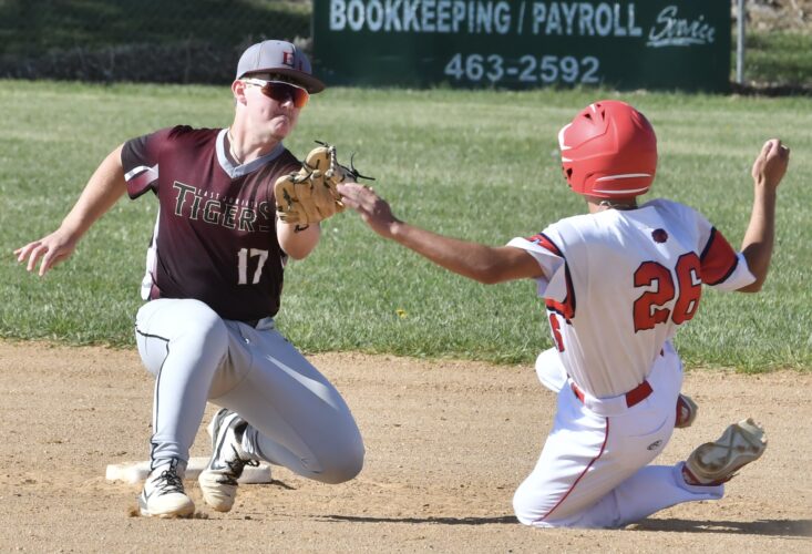 Sentinel photo by MIKE GOSS East Juniata's Ryan Greising tags out Juniata's Daylyn Kennedy on an attempted steal of third base.