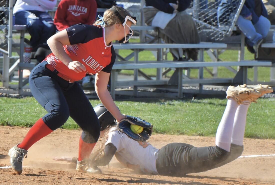 Sentinel photo by MIKE GOSS Juniata's Destiny Yohn puts a tag on Upper Dauphin's Makenna Schaffner on a close play at third base.