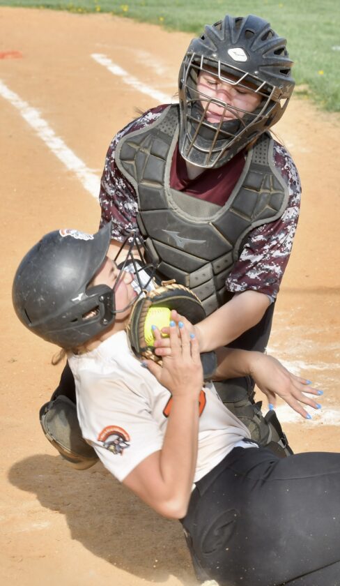 Sentinel photo by MIKE GOSS East Juniata catcher Gracie Myers tags out Upper Dauphin's Amaya Hoffman in a collision at home plate.