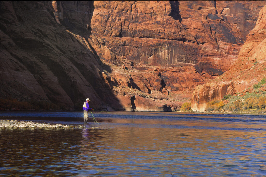 In this photo provided by Terry Gunn, an angler casts a line at Lees Ferry near Marble Canyon, Ariz. June 7, 2011. From prized rainbow trout to protected native fish, declining reservoirs are threatening the existence of these creatures, and also increasing the cost of keeping them alive. (Terry Gunn via AP)