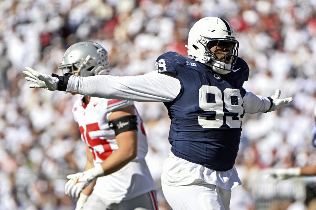 Penn State defensive tackle Coziah Izzard (99) celebrates a tackle against Ohio State during the second quarter of an NCAA college football game, Saturday, Nov. 2, 2024, in State College, Pa. (AP Photo/Barry Reeger)