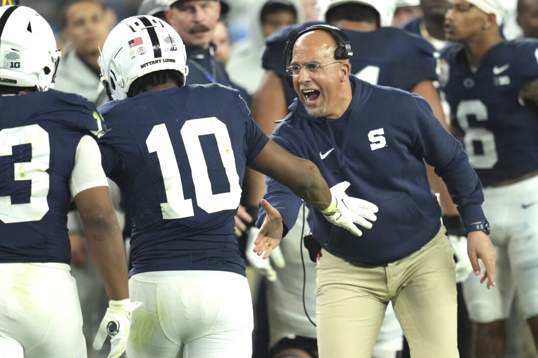 FILE - Penn State head coach James Franklin, right, celebrates with running back Nicholas Singleton after a touchdown during the second half of the Fiesta Bowl College Football Playoff game against Boise State, Dec. 31, 2024, in Glendale, Ariz. (AP Photo/Ross D. Franklin, File)