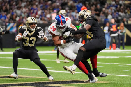 New York Giants tight end Theo Johnson (84) pulls in a touchdown reception between New Orleans Saints cornerback Kool-Aid McKinstry (4) and safety Jonas Sanker (33) in the first half of an NFL football game in New Orleans, Sunday, Oct. 5, 2025. (AP Photo/Gerald Herbert)