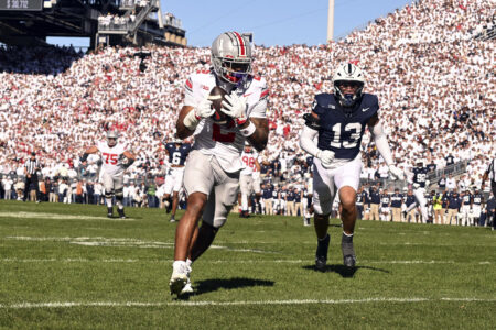 Ohio State wide receiver Emeka Egbuka (2) catches a touchdown pass in front of Penn State linebacker Tony Rojas (13) during the first quarter of an NCAA college football game, Saturday, Nov. 2, 2024, in State College, Pa. (AP Photo/Barry Reeger)