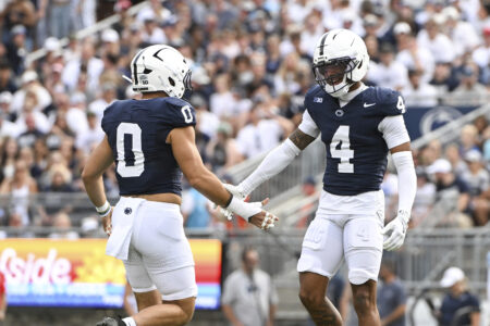 Penn State cornerback A.J. Harris (4) celebrates a stop with linebacker Dominic DeLuca (0) against Villanova during the first quarter of an NCAA college football game, Saturday, Sept. 13, 2025, in State College, Pa. (AP Photo/Barry Reeger)