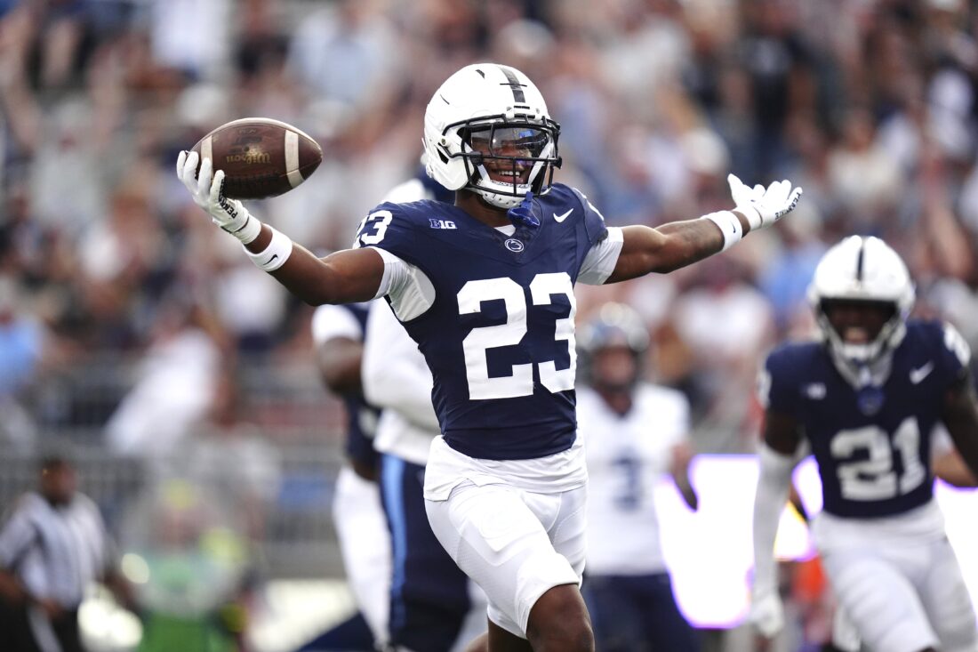 Penn State cornerback Jahmir Joseph (23) celebrates a pick-six during the fourth quarter of an NCAA college football game against Villanova, Saturday, Sept. 13, 2025, in State College, Pa. (AP Photo/Jared Freed)