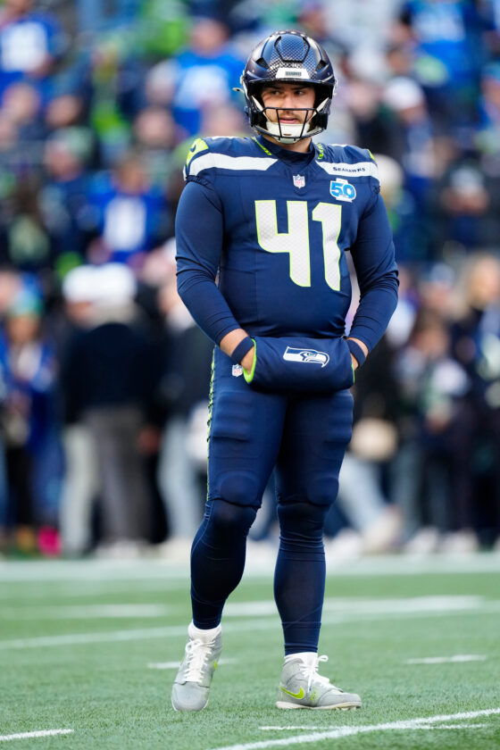 Seattle Seahawks long snapper Chris Stoll (41) looks on during the NFC Championship NFL football game, Sunday, Jan. 25, 2026, in Seattle. (AP Photo/Ben VanHouten)