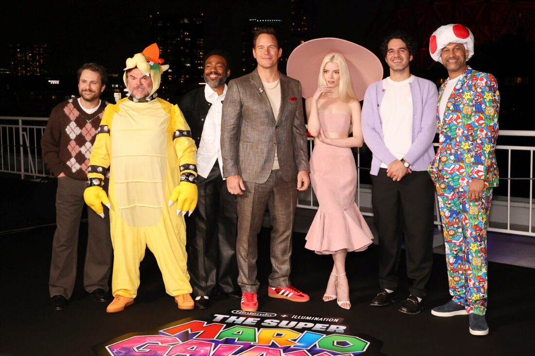 Charlie Day, from left, Jack Black, Donald Glover, Chris Pratt, Anya Taylor-Joy, Benny Safdie and Keegan Michael Key pose for photographers at the photo call for the film "The Super Mario Galaxy Movie" in Tokyo, Thursday, March 26, 2026. (AP Photo/Rodrigo Reyes)